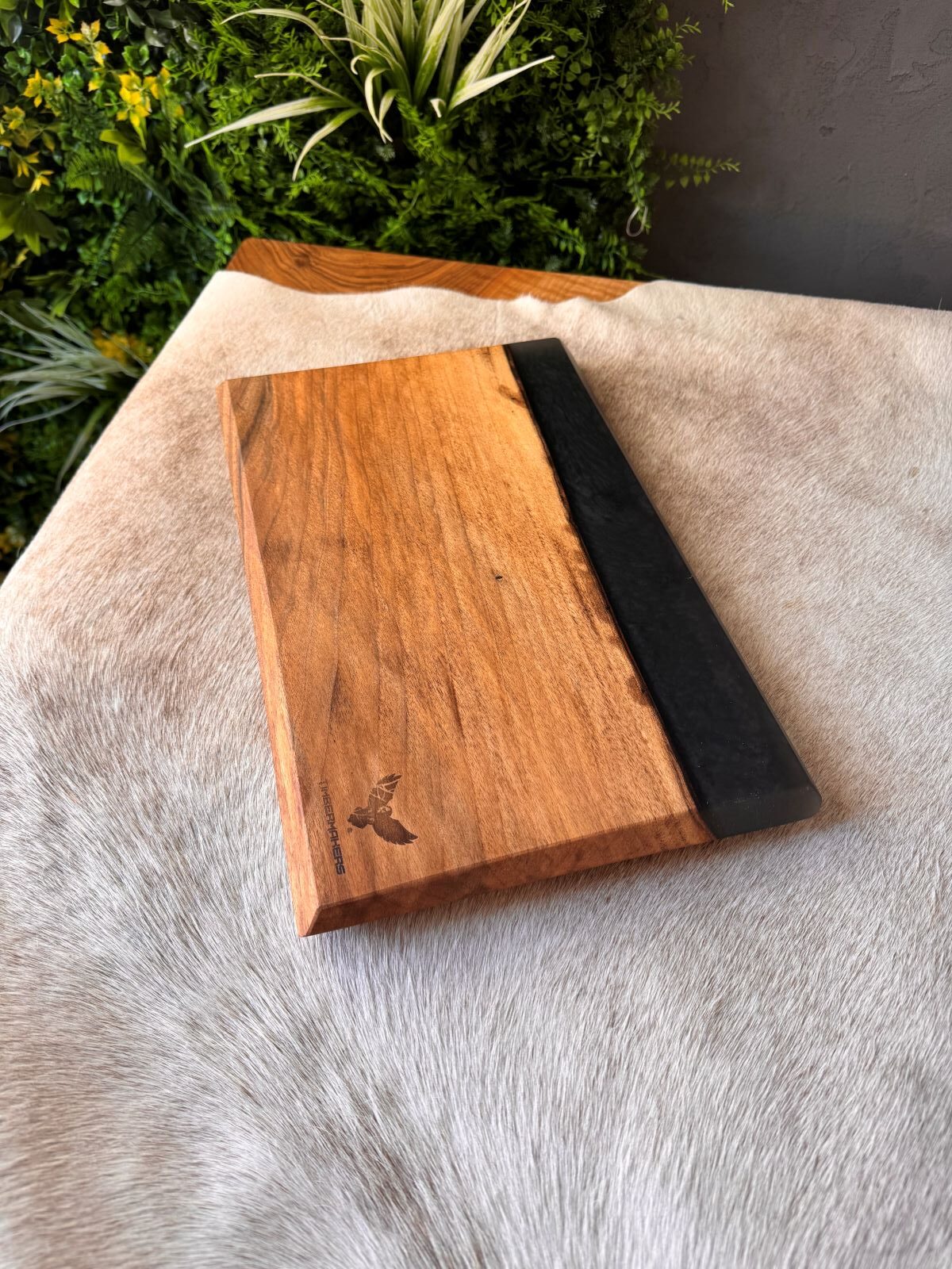 Ručně vyráběné prkénko z ořechového dřeva a černé pryskyřice. Povrchová úprava přírodním olejem Odie´s oil, který je určen pro styk s potravinami.