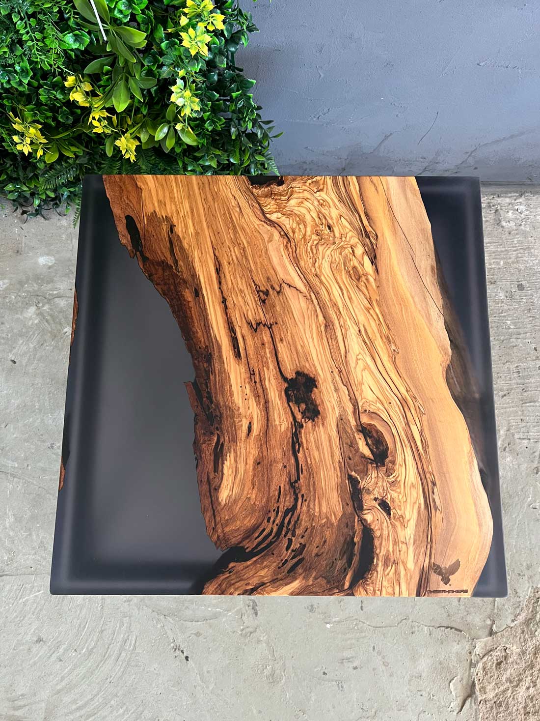 Designový stolek z cca 600 let starého olivového kmene ze Sicílie, v kombinaci s pryskyřicí LIGHT GREY. Exkluzivní limitovaná série z olivového dřeva – nyní v Black Friday akci se slevou 50 %. Kompaktní rozměry 50 × 50 cm, výška 45 cm, masivní deska o tloušťce 5 cm.