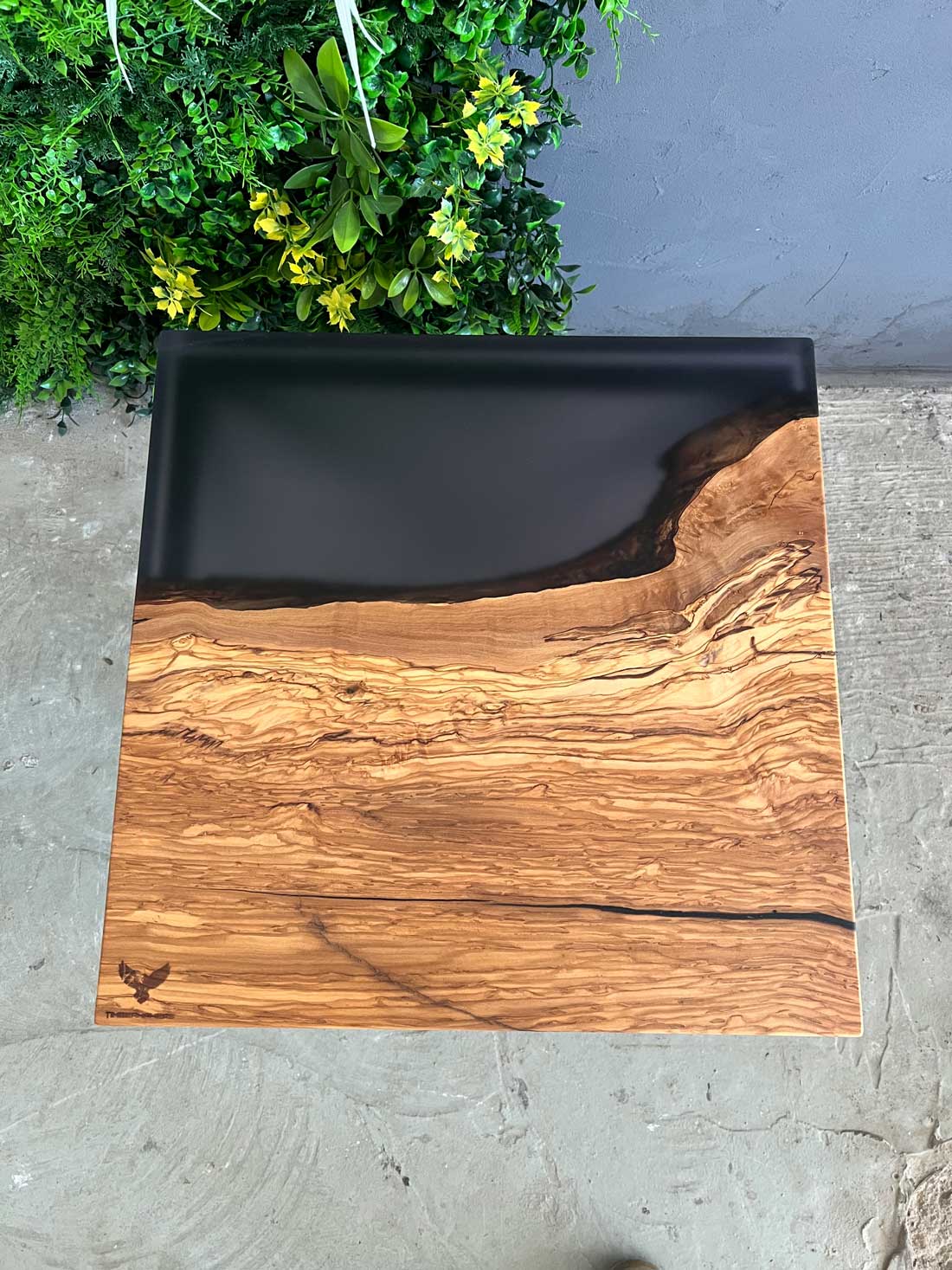 Designový stolek z cca 600 let starého olivového kmene ze Sicílie, v kombinaci s pryskyřicí LIGHT GREY. Exkluzivní limitovaná série z olivového dřeva – nyní v Black Friday akci se slevou 50 %. Kompaktní rozměry 50 × 50 cm, výška 45 cm, masivní deska o tloušťce 5 cm.