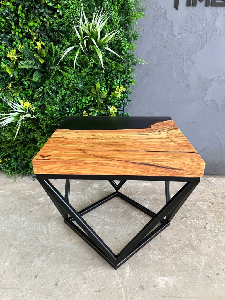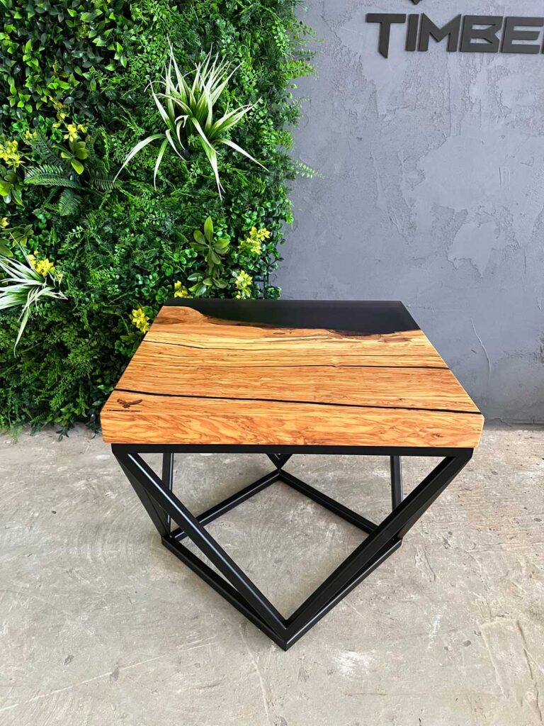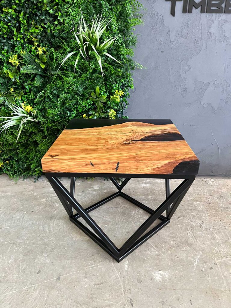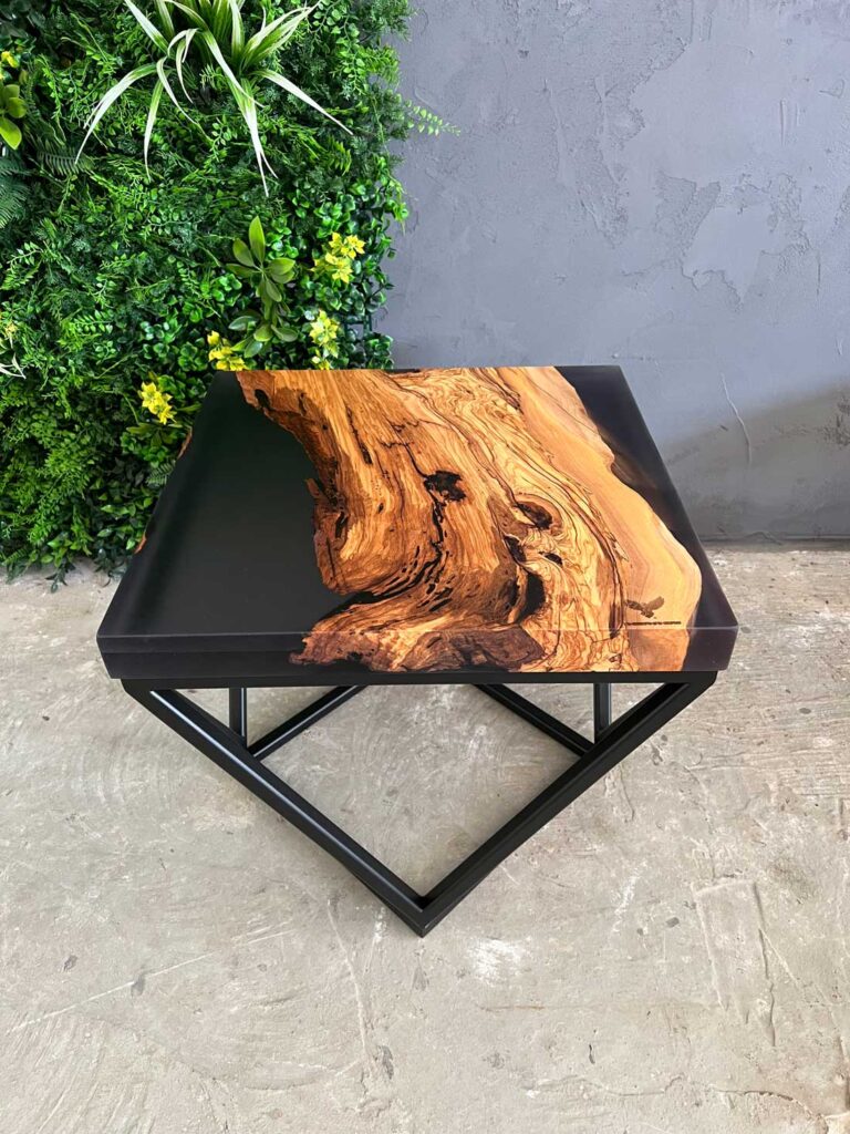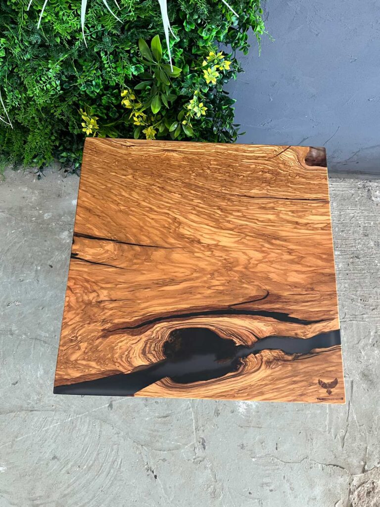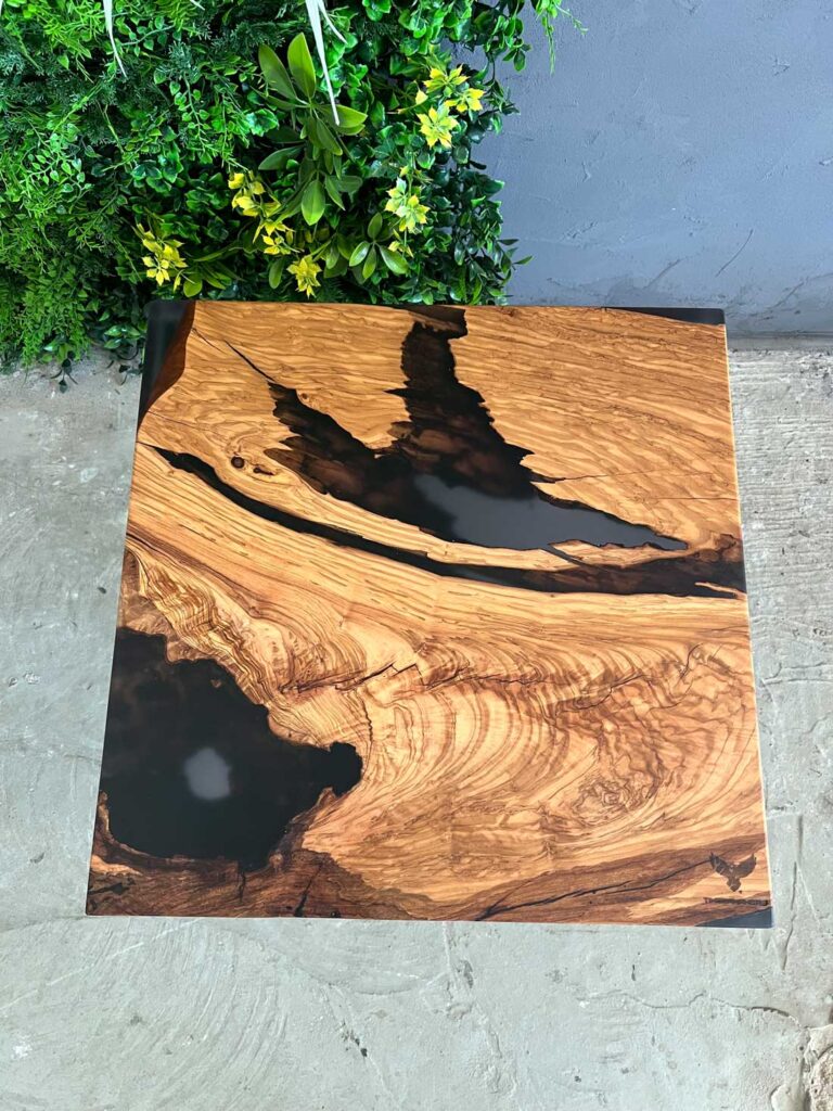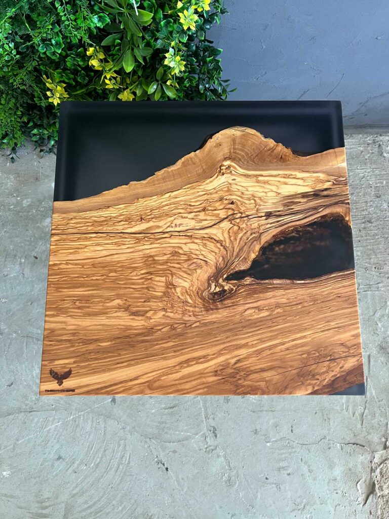 Designový stolek z cca 600 let starého olivového kmene ze Sicílie, v kombinaci s pryskyřicí LIGHT GREY. Exkluzivní limitovaná série z olivového dřeva – nyní v Black Friday akci se slevou 50 %. Kompaktní rozměry 50 × 50 cm, výška 45 cm, masivní deska o tloušťce 5 cm.